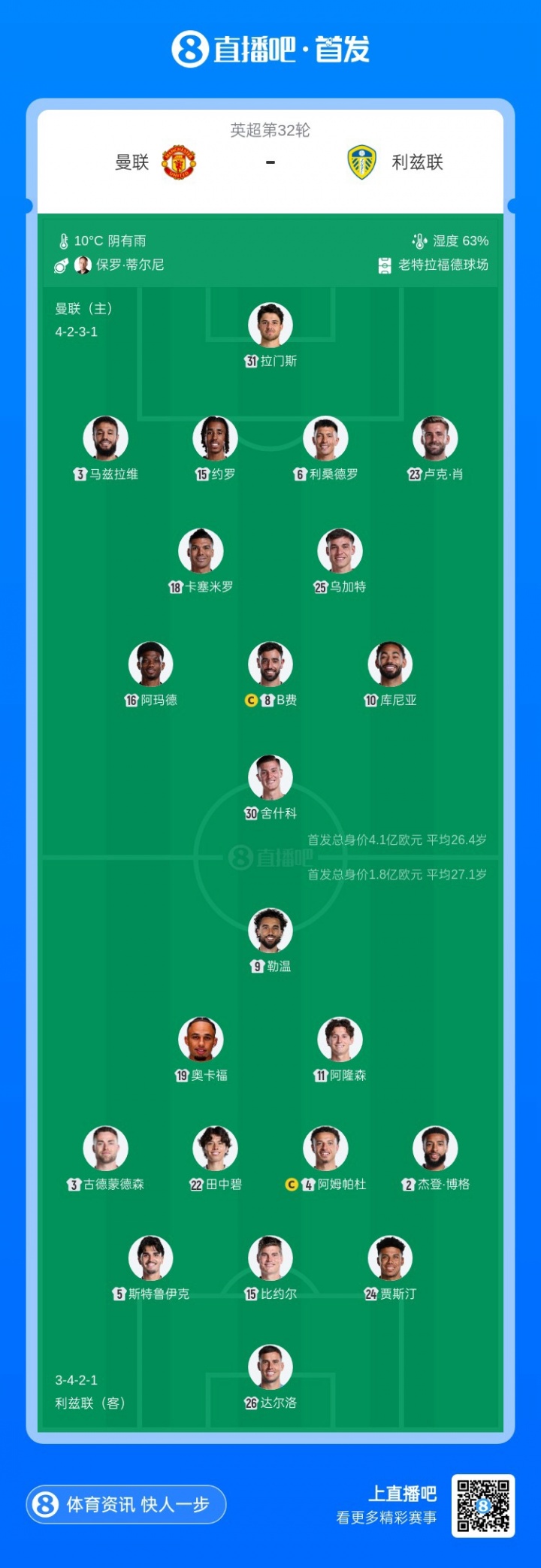 直播吧4月14日讯 英超第32轮,曼联对于阵利兹联,赛前首发颁布