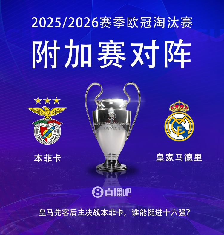 直播吧01月30日讯 2025/26赛季欧冠淘汰赛阶段附加赛抽签结果今日出炉,皇马vs本菲卡,穆帅重返伯纳乌,皇马先客后主争夺16强名额。