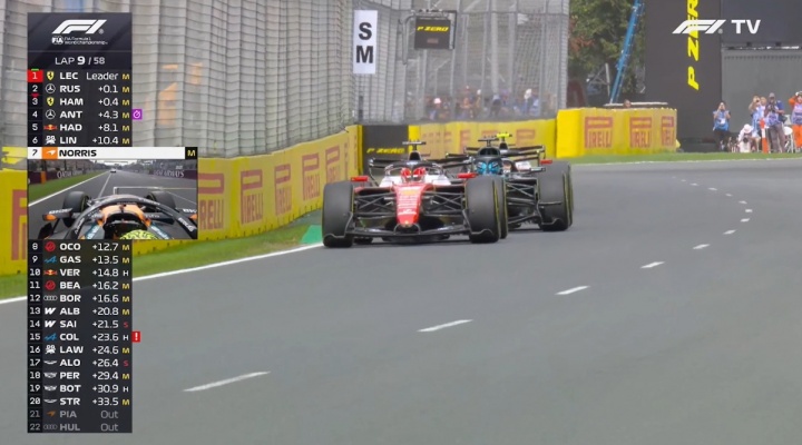 第8圈,勒克莱尔与拉塞尔又屡次交流地位,死后的汉密尔顿跟安东内乱利也放大了与前两名的间隔↓