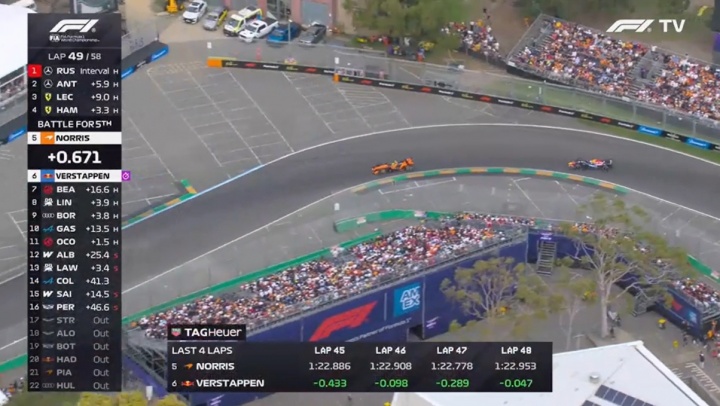 维斯塔潘在末了10圈一度哀伤诺里斯死后0.5秒阁下,但无奈告竣超过↓