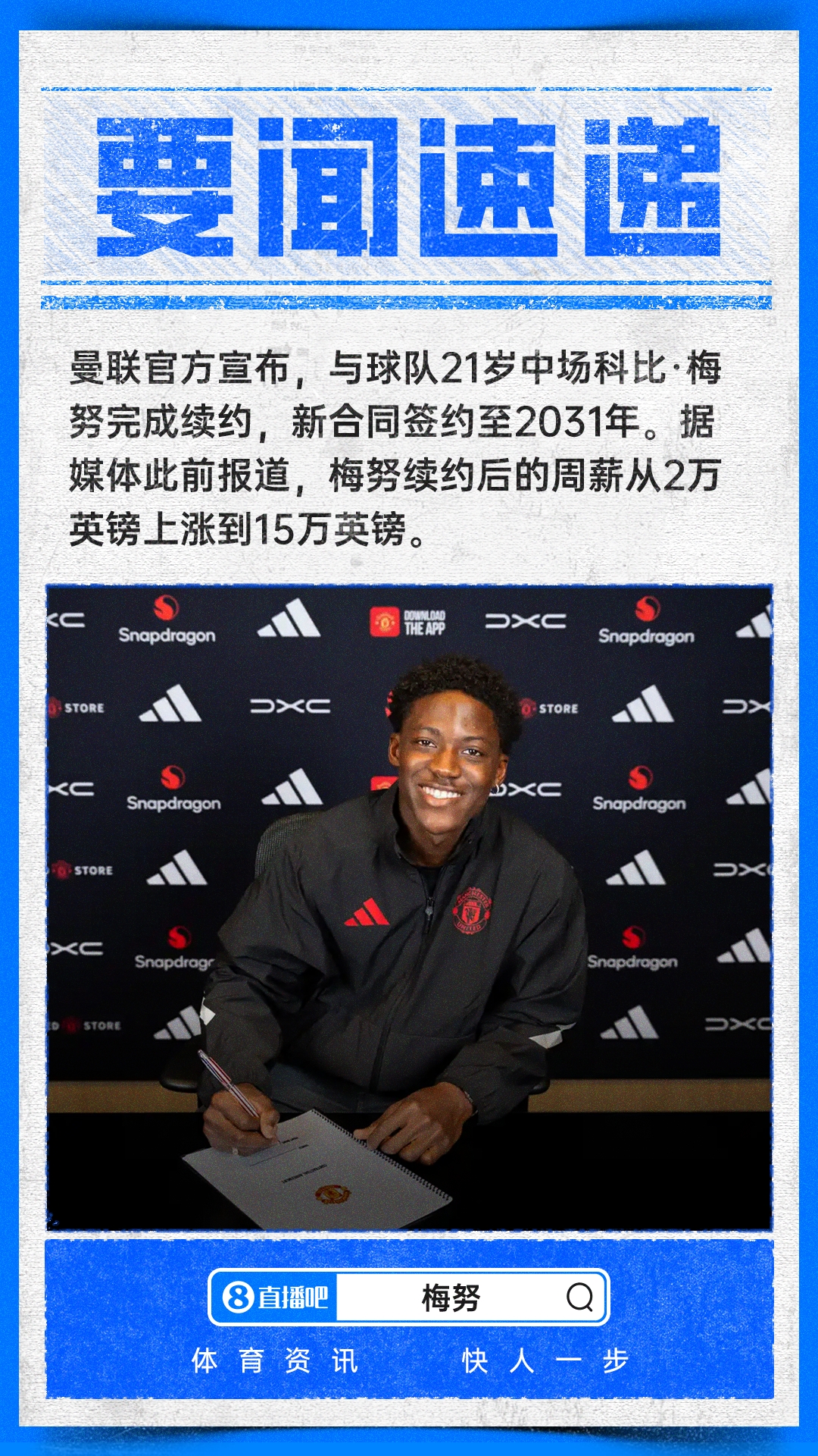留下将来!民间:曼联与21岁梅努续约至2031年,新公约周薪15万镑