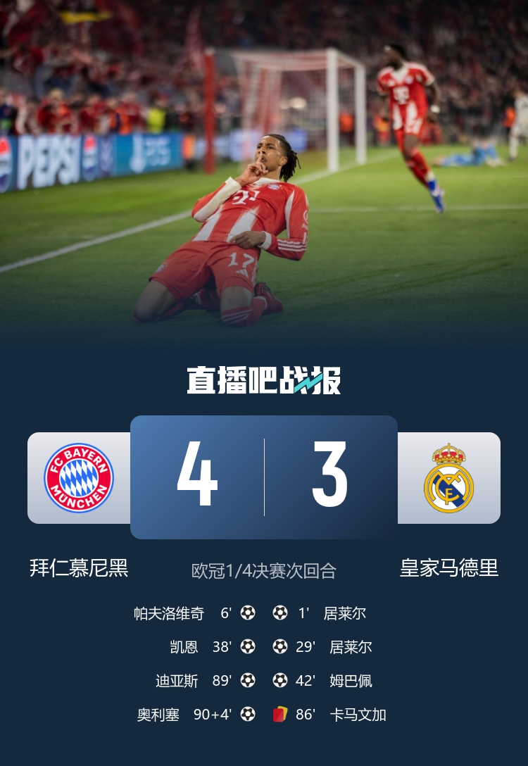 名局!拜仁4-3总比分6-4十人皇马 迪亚斯奥利塞制服卡马文加染红