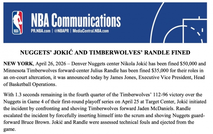 NBA民间布告呈现,约基奇被罚金是由于浮薄举事端,兰德尔被罚金是由于缓和矛盾,不人由于此次矛盾被禁赛