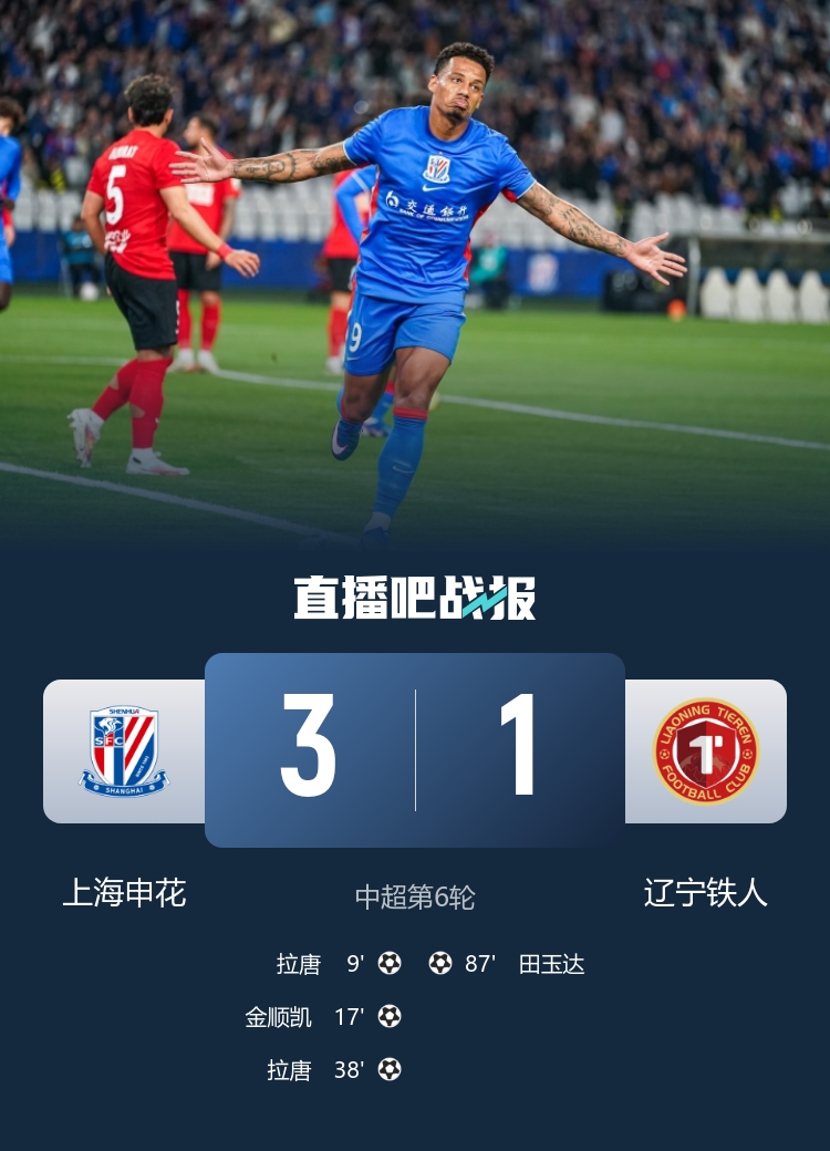 第61分钟,吴曦送出直塞,拉唐失掉半单刀机遇,但他的叩门稍微打偏。本场角逐当时,上海申花联赛3连胜积4分暂列第八,辽宁铁人积7分暂列第五。↓