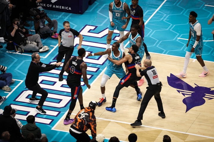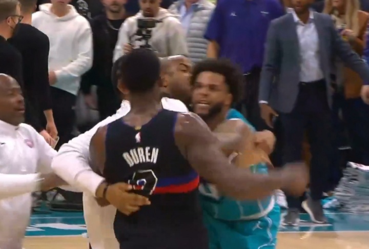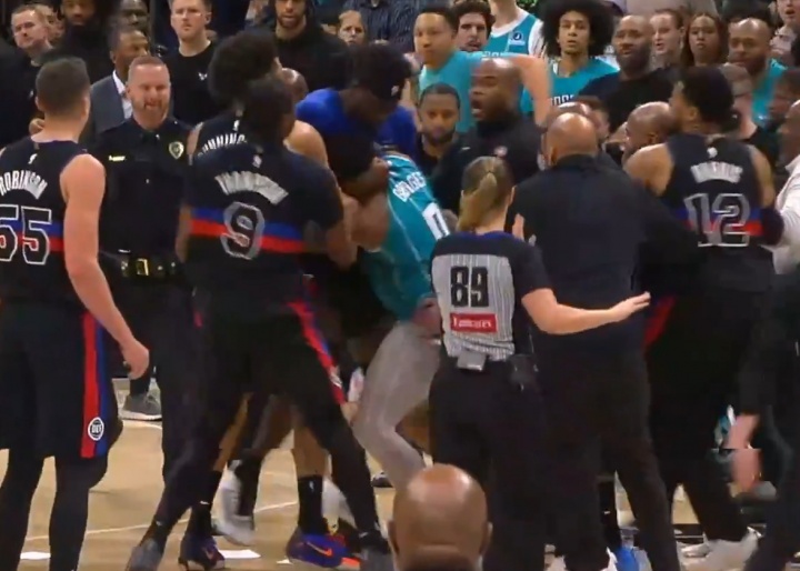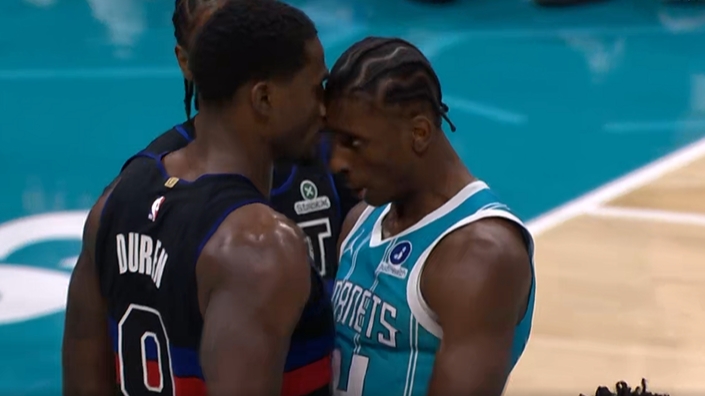 NBA向例赛,活塞客战黄蜂,第三节7分06秒,杜伦背打形成迪亚巴特犯规。杜伦推户口迪亚巴特后,后者欲挥拳出击但失!随后迪亚巴特躲过多人拦挡奔袭再次攻打杜伦,降级为多人超年夜矛盾!