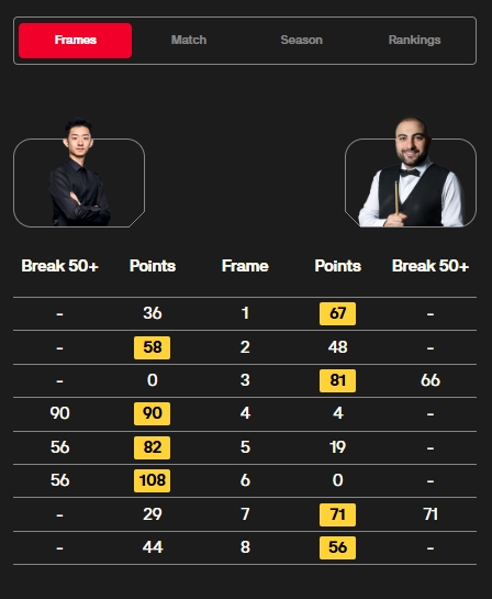吴宜泽打出单杆90、56、56 分,侯赛因·瓦菲打出单杆66、71分,第一阶段战罢,吴宜泽与瓦菲战成4-4平。二阶段,4月29日21:30分隔打。