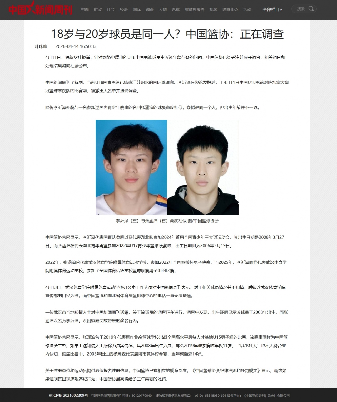 原文如下:4月11日,据新华社报讲读,针对于收集中爆出的U18华夏男篮球员李沂泽年纪存疑的成绩,华夏篮协曾经存眷并睁开考察,相干考察跟处置惩罚成果将向社会颁布。李沂泽在言论发酵后,于4月11日华夏U18男篮对于阵加拿年夜王冠篮球学院队的角逐前,被撤出台甫单并接收考察。