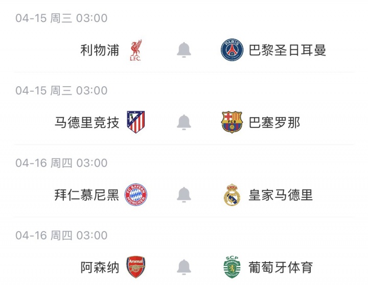 次回合将于4月15/16日停止,利物浦、马竞、拜平和阿森纳主场兴办。