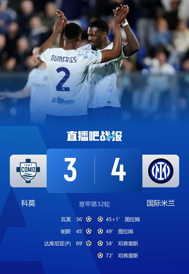 让二追四!国米4-3逆转客胜科莫 小图拉姆、邓弗里斯双响帕斯立功