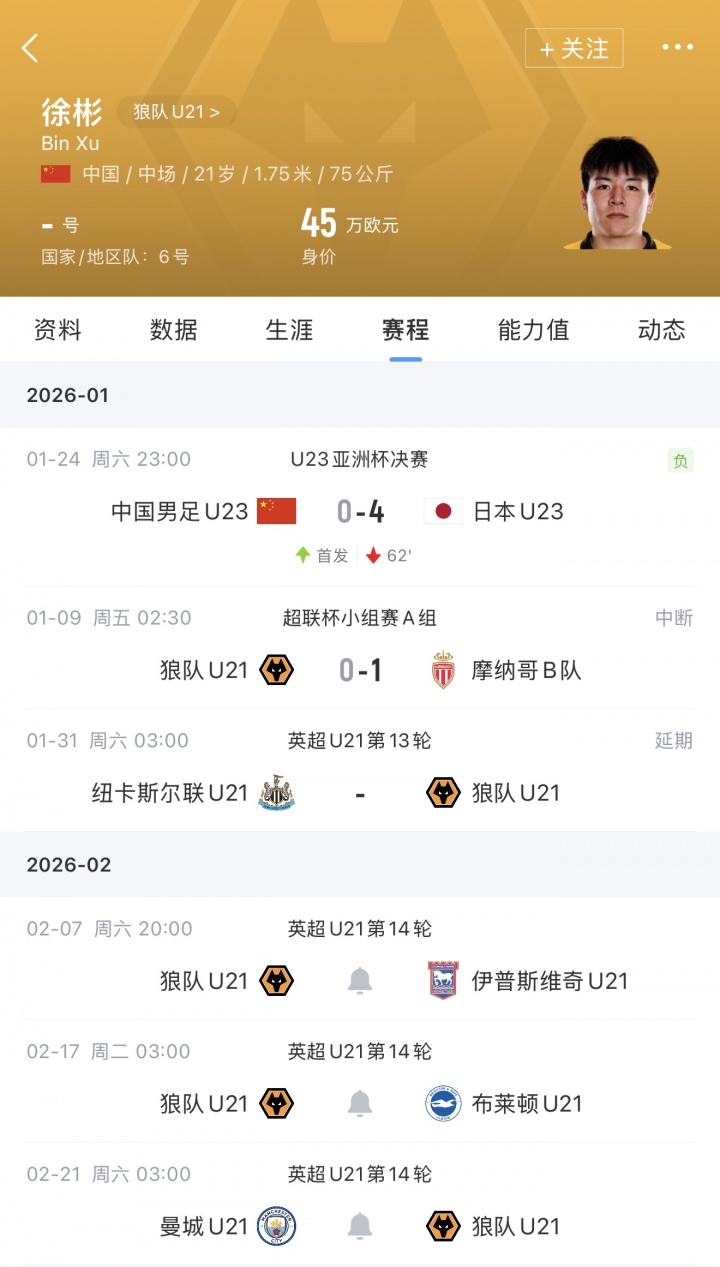 :如有意外徐彬周六演出留洋首秀 狼队U21主场战伊普斯维奇