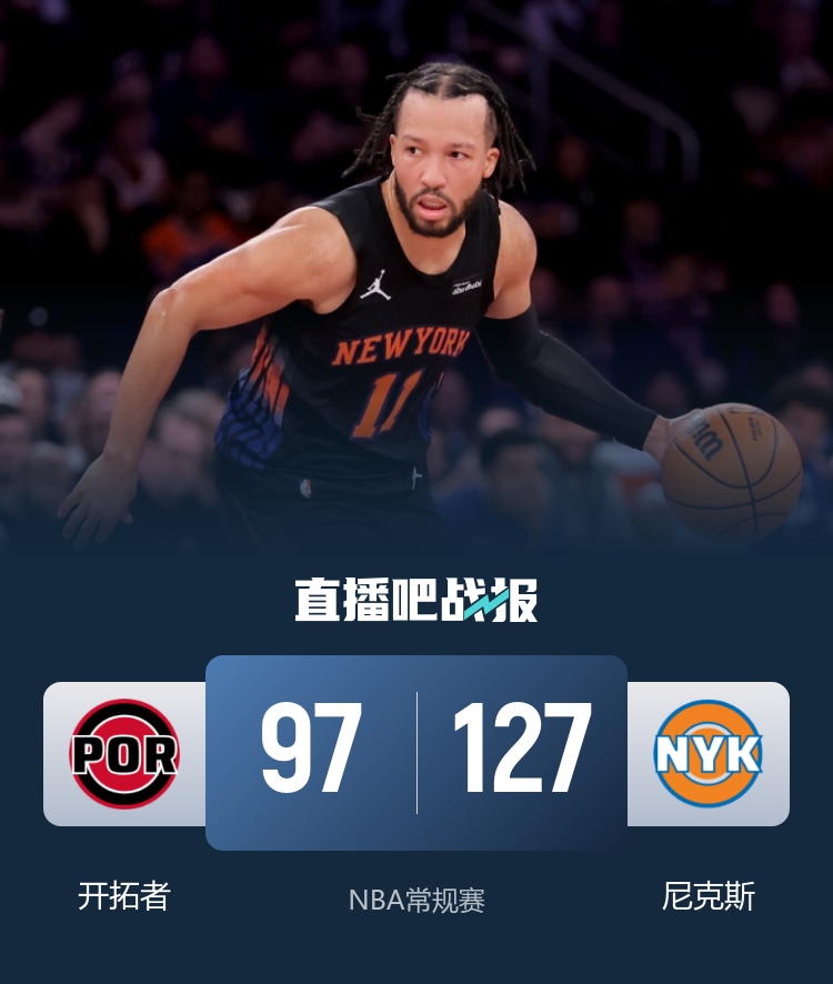 尼克斯(30-18):布伦森26分1板2助2断、阿努诺比24分6板3助、哈特20分6板5助2断、唐斯14分20板3助、科勒克13分2板4助、迪亚瓦拉10分3板2助、布里奇斯10分2板5助3断、沙梅特3分1板2助、狄龙·琼斯3分、罗宾逊2分7板2助、胡克波尔蒂2分2板、亚布塞莱2板。