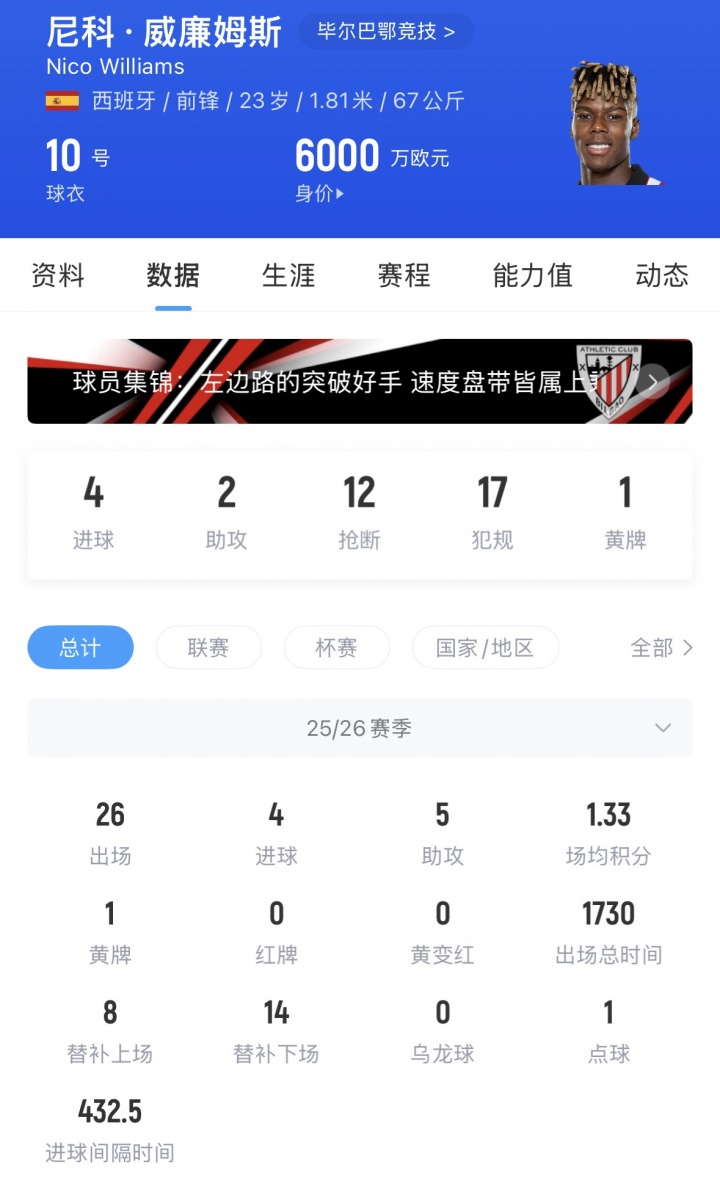 尼科·威廉姆斯现年23岁,他本赛季进场26次,仅奉献4球5助