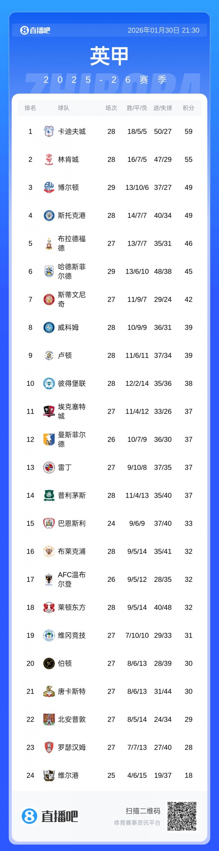 巴恩斯利目前24轮9胜6平9负积33分,排名英甲第15位,但是少赛4轮。