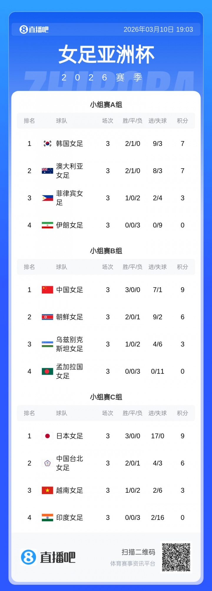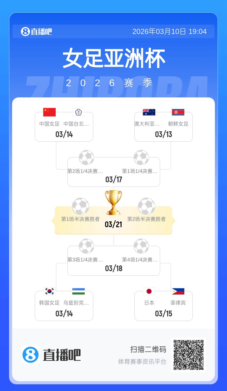 直播吧03月10日讯 少女饱读亚洲杯小组赛停止,华夏少女饱读3战全胜升级8强,1/4决赛的敌手将是华夏台北少女饱读,角逐时光为北京时光3月14日周六13点,胜者将纵贯少女饱读天下杯。