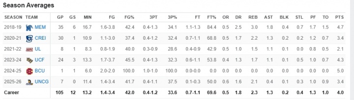 安托万·琼斯于今在NCAA出战了6个赛季的角逐,共出战105场角逐,场均13.2分钟,能够失掉4.0分2.3篮板1.3助攻,投篮掷中率42.0%,三分掷中率33.6%,罚球掷中率69.6%。