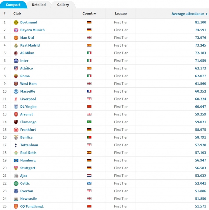 直播吧04月27日讯 据德转数据统计,年夜连英博主场梭鱼湾的均匀上座人数为60047人,位列寰球第12,高于阿森纳酋长球场的59359人。别的,重庆铜梁龙主场均匀上座51571人,位列寰球第25