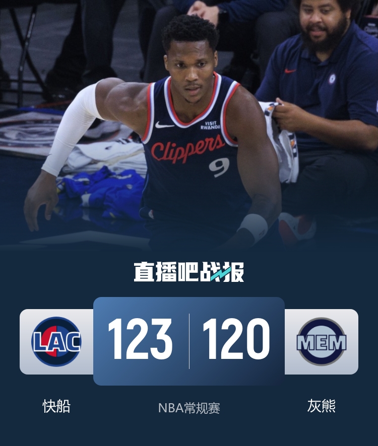 快船(31-32):伦纳德28分5板2助、马瑟林21分10板1助、加兰21分4板6助、琼斯16分4板1助、米勒14分1板2助、杰克逊12分12板3断、桑德斯7分2板2断、洛佩斯4分1板、邓恩3板3助2断、克里斯蒂2板 灰熊(23-39):杰罗姆23分2板7助3断、亨德里克斯18分4板2助2断2帽、科沃德15分7板、GG·杰克逊14分7板1助、斯潘塞12分3板4助、小皮蓬11分3板3助、普罗斯珀11分2板2助、韦尔斯8分1板1助、马沙克4分1板、克莱顿2分2板6助、斯莫尔2分2板3助