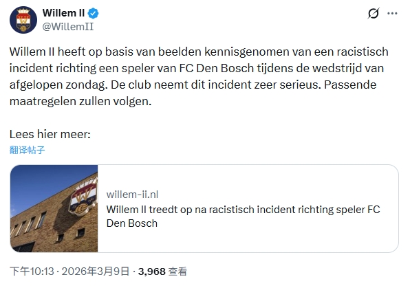 直播吧03月10日讯 荷乙第30轮,邓伯什客场1-1战平威廉二世,华夏留洋小将王博豪在荷乙赛场遭大米族轻视,敌手球迷作念出“拉眼角”这一带有大米族轻视色调的得罪性手势。赛后没有到24小时,北京时光3月9日22:13,威廉二世俱乐部宣布布告表现已经由过程顾念频得悉这次轻视事宜,俱乐部高度看重独立即向邓伯什以及王博豪抱歉,现已锁定轻视者并将采用响应的办法。