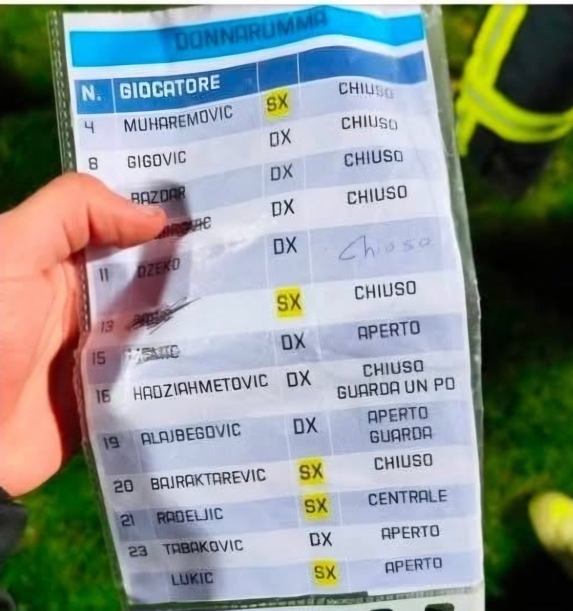 在这张小抄中,“centrale”指的是球门中路,“aperto”意为“关上”——平日指鼎力大举射向一侧、标的目的明白,“chiuso”意为“敞开”——常指球员隐蔽射门用意或稳当地打向某一侧。 而据图片报此前报讲读,是多纳鲁马抢走了波黑沉沉门将的小抄。“Guarda un po”有趣是“稍故故观测”,指球员在射门前偶然会瞄一眼门将意向,能够暂且转变标的目的;而“DX”代表门将的右侧,“SX”代表门将的左侧。