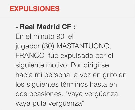 据《马卡报》报讲读,主裁在裁判陈诉中记载,马斯坦托诺对于他讲读:“真丢人,真xx的丢人(vaya vergüenza, vaya puta vergüenza)”