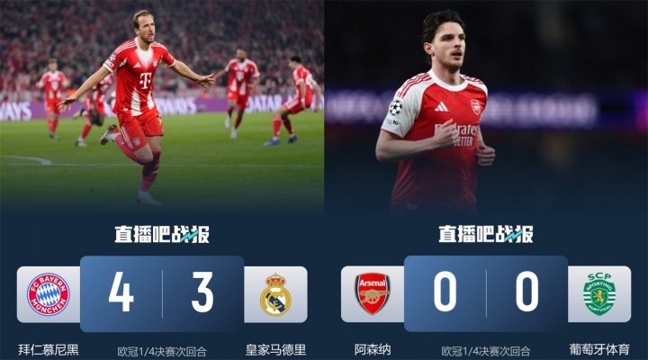 直播吧04月16日讯 欧冠8强次回合,皇马3-4总比分4-6没有敌拜仁,阿森纳则0-0总比分1-0葡体升级。两场同阶段的欧冠镌汰赛,排场天壤之别。