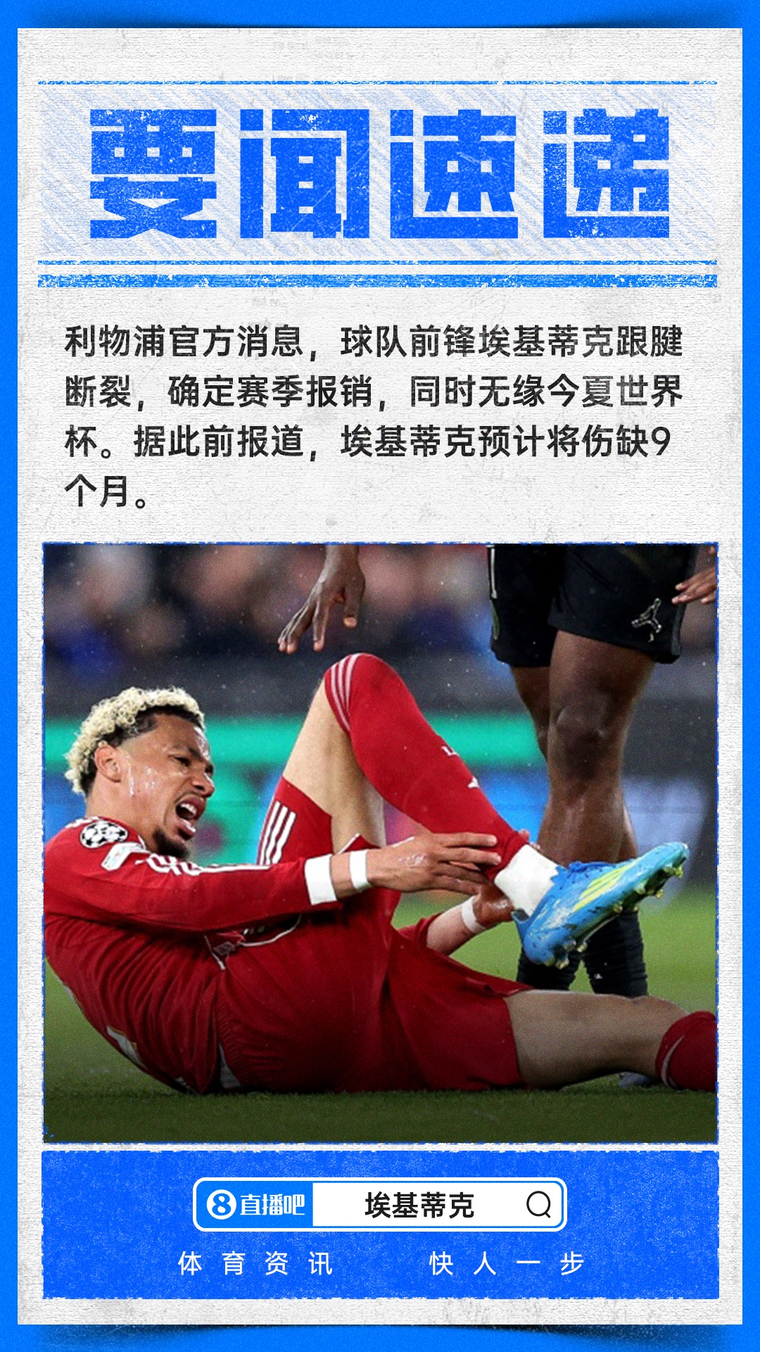 【民间布告】利物浦饱读球俱乐部证实,埃基蒂克遭受了重大的和腱伤势。