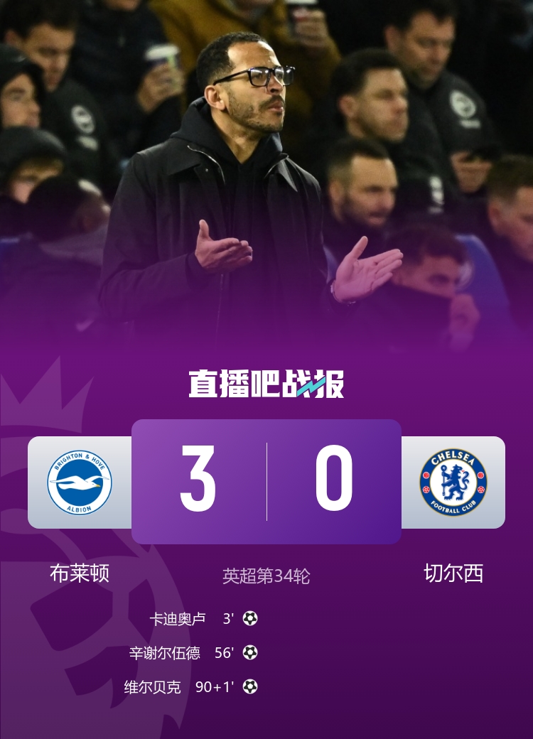 联赛5连败!切尔西0-3布莱顿跌至第7先赛距前五7分 卡迪奥卢闪打拼