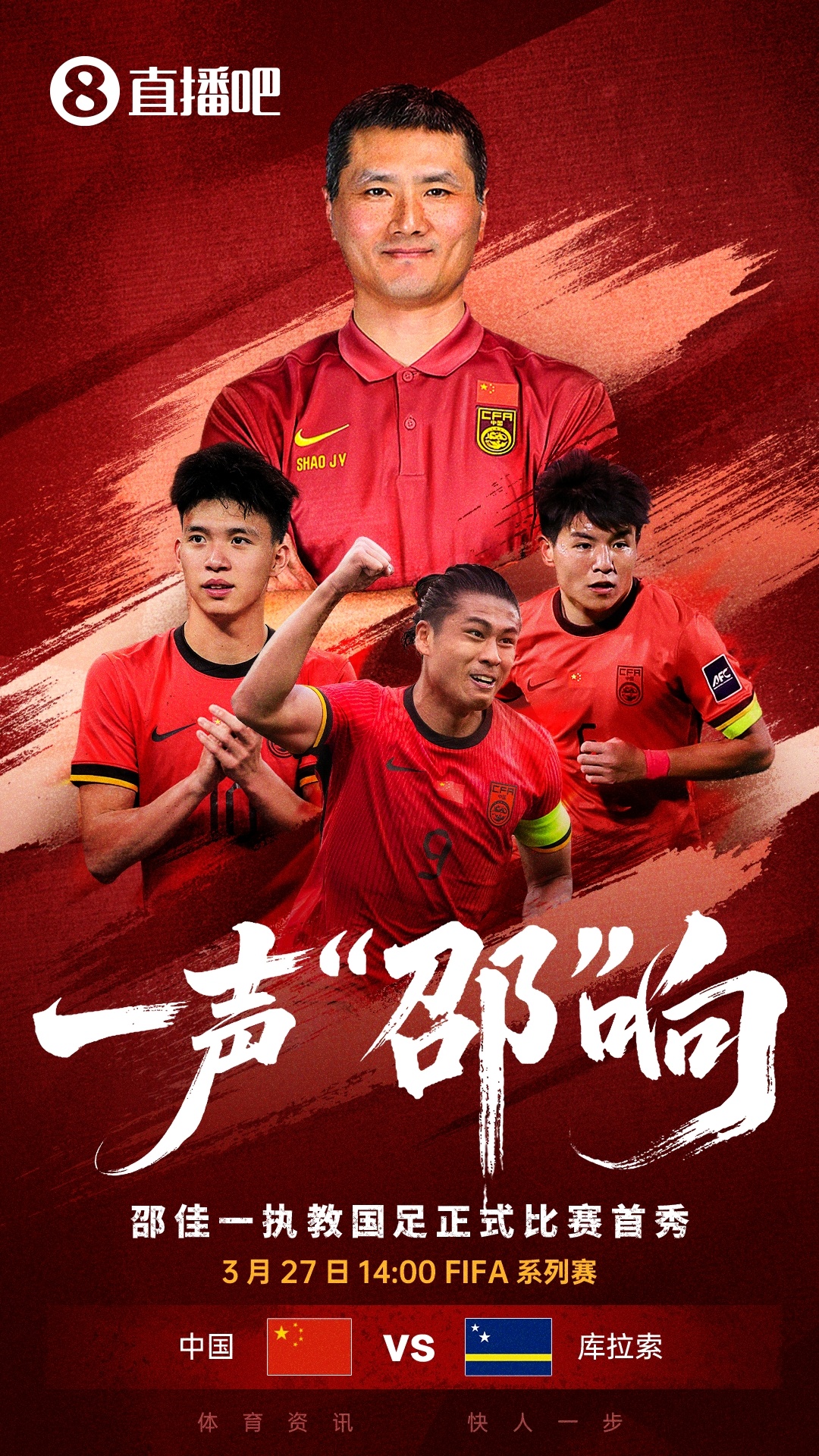 3月27日14:00,FIFA系列赛,华夏男饱读将在悉尼澳年夜利亚运动场对于阵库拉索,邵好意思一迎来合手教国饱读的郑重角逐首秀!