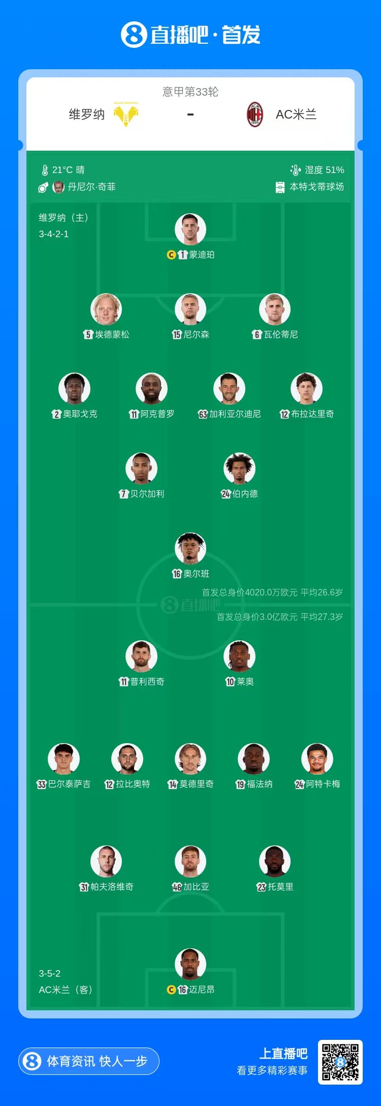 维罗纳首发:1-蒙迪珀、2-奥耶戈克、5-埃德蒙松、6-瓦伦蒂尼、7-贝尔加利、12-布拉达里奇、15-维克托·尼尔森、11-阿克普罗、24-伯内乱德、63-加利亚尔迪尼、16-吉福特·奥尔班维罗纳替补:3-弗雷塞、34-佩里利、94-托尼奥洛、14-利罗拉、19-斯洛特萨格、37-科特查普、70-占姆、4-洛夫里奇、21-哈鲁伊、73-穆斯拉蒂、41-伊萨克·托米奇、72-阿贾伊、90-约安·维尔梅桑